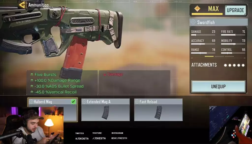 ハルバード マグ 100% のダメージ範囲で 5 回のバースト ショットを提供し、ADS 弾丸の拡散と垂直反動をそれぞれ 30% と 45% 改善します。 拡張マガジン A を装備することもできます ただし、機動性とリロード時間がわずかに犠牲になります。