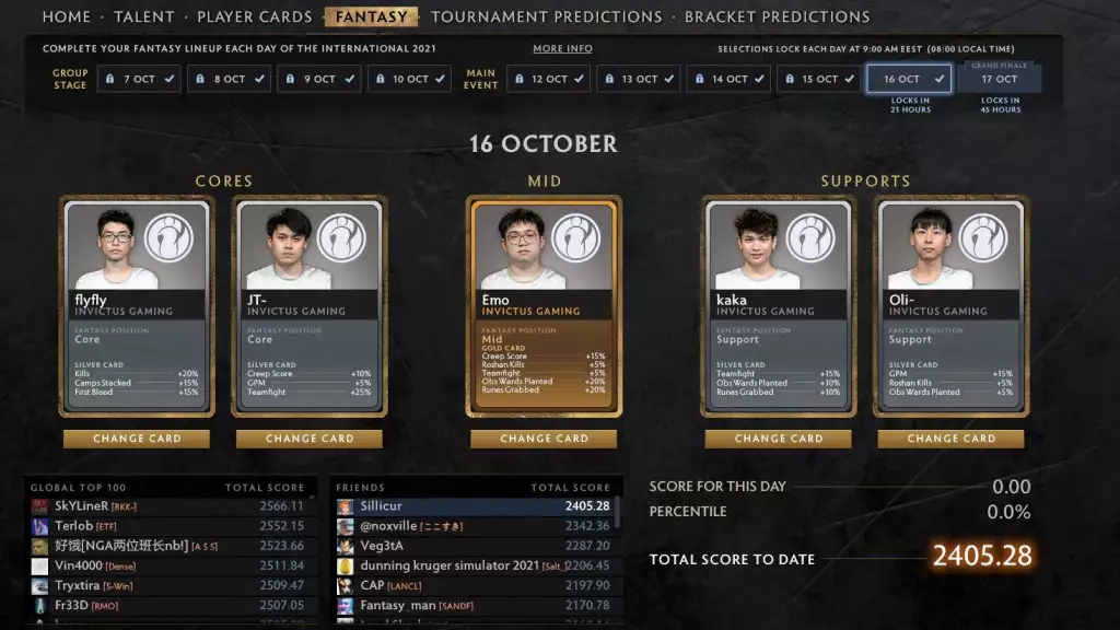 グループ ステージとメイン イベントの 4 日目のファンタジー予測の後、2405 ポイントを獲得し、Dota 2 ファンタジー予測全体の上位 1% にランクされました。