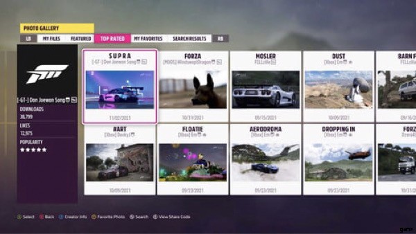 車のメーカー、車のモデル、色、または特定の作成者に基づくキーワードを使用して、コミュニティの写真を閲覧できる便利な検索バーもあります。プレーヤーは、探している特定の写真を見つけることができる共有コードを使用して画像を検索することもできます。