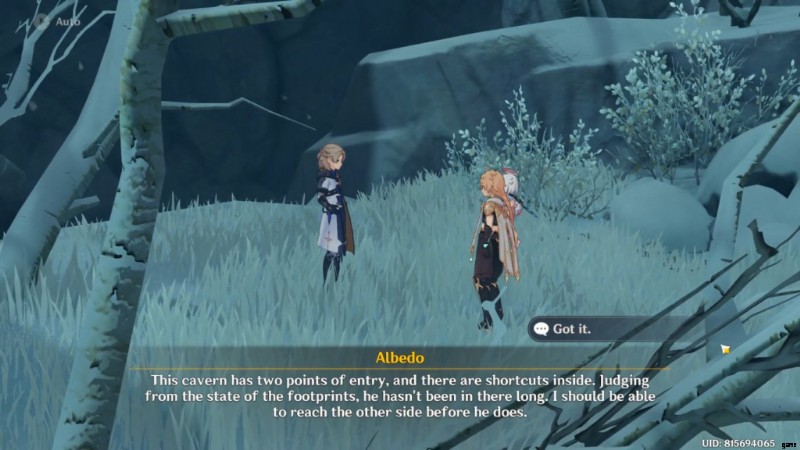 泥棒を見つけるには、Elemental Sight を使用して足跡をたどる必要があります。これは、戦う敵がたくさんいるかなり長い道のりになるので、これらの脅威に備えるようにしてください.足跡は洞窟の入り口で終わりますが、アルベドはあなたが外で待っている間、泥棒を見つけて対処することを申し出ます.