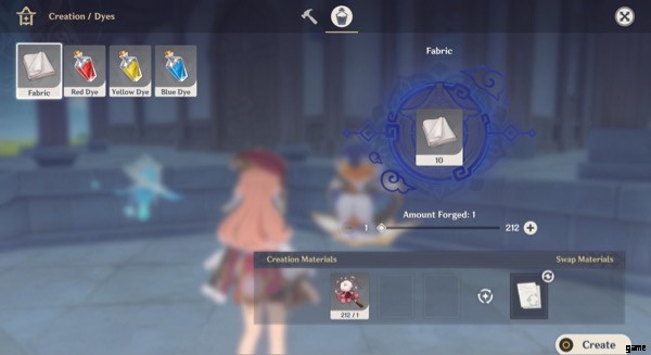 後で説明する家具は、家具、装飾品、オブジェクトを作成できる場所です。クリエーションでは、クラフト家具に使用する生地や染料をリソースからクラフトできます。