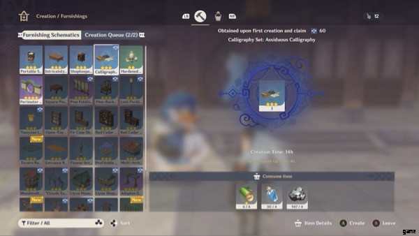 ベンダーやタビー、チャビーから設計図を入手したら、クラフト プロセスを開始できます。タビーと話し、[家具の作成] タブをクリックして開始します。旅行者はすぐに、さまざまな家具アイテムを作成するのが時間のかかるプロセスであることに気付くでしょう。完了までに最大 16 時間かかるものもあります。
