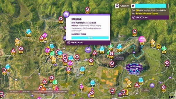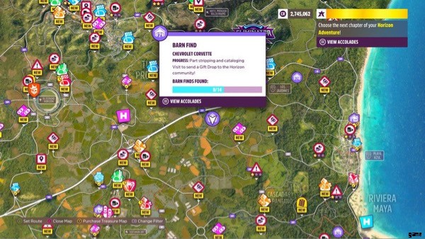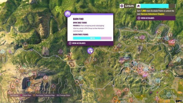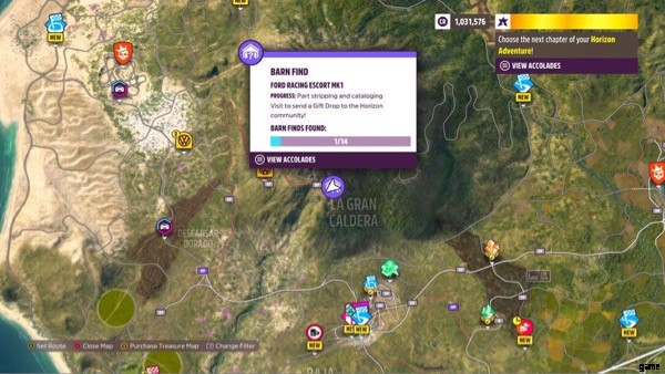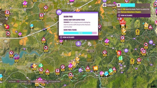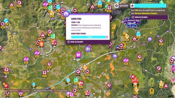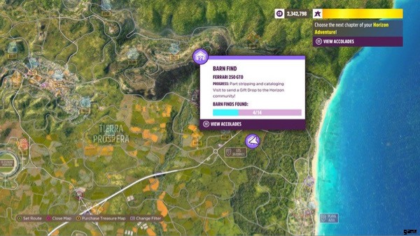 プレーヤーは、マップ全体に納屋の発見物を見つけて、その中に隠された珍しい車やヴィンテージの車を見つけることができます。納屋探しの噂を選択することで、プレイヤーはこれらの納屋がどこにあるかについて漠然とした場所を知ることができます.