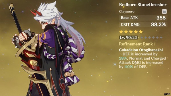 Redhorn Stonethresher のパッシブ (特殊能力)、Gokadaiou Otogibanashi には、キャラクターの DEF ステータスを 28% 増加させるという 2 つの効果があります。このパッシブの 2 つ目の効果は、通常攻撃とチャージ攻撃のダメージを DEF ステータスの 40% だけバフすることです。