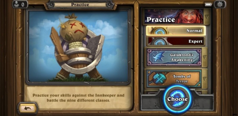 - 9 クラスのロックを解除 - デフォルトでアンロックされる最初のクラスはメイジ (Jaina Proudmoore ヒーロー) です。その後、残りの 8 つのクラスのロックを解除する必要があります。 ソロ アドベンチャーに移動 、次に練習 、次に通常。 そこでは、他のクラスをプレイしている AI をプレイして打ち負かす必要があります。 AI ドルイドに勝つとそのクラスのロックが解除され、AI ウォリアーに勝つとウォリアー クラスのロックが解除されます。そのクラスを平準化し、追加するより強力な基本カードのロックを解除するため、メイジでプレイしてすべてのヒーローのロックを解除することをお勧めします。それらをあなたのデッキに。これらすべてを行うと、 クラシック パック が 2 つ得られます 100 ゴールド