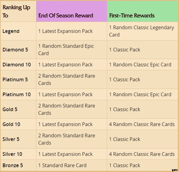 - 見習いリーグ - ハースストーンの新規プレイヤーは見習いリーグから始めます。このリーグには見習い 40 から見習い 1 までの 40 のランクがあります。これらのランクは新規プレイヤー専用であり、プレイヤーはこれらのランクでスターを失うことはありません。心配する必要はありません。そこに行ってプレイしてください。経験値を集め、ヒーローをレベルアップし、報酬を獲得するのに役立ちます! 3 つのクラシック カード パックを獲得できます 見習い 35、25、15、および 5 でランク マイルストーンに到達すると。見習い 1 および見習いリーグ全体から進むと、2 つのクラシック パックと、最新の 4 つのハースストーン 拡張用にそれぞれ 2 つのパックを獲得できます。最も重要なことは、ドラゴン年 (2019 年からの拡張) のフルデッキを 1 つ無料で入手できることです 、お好きなクラスに!