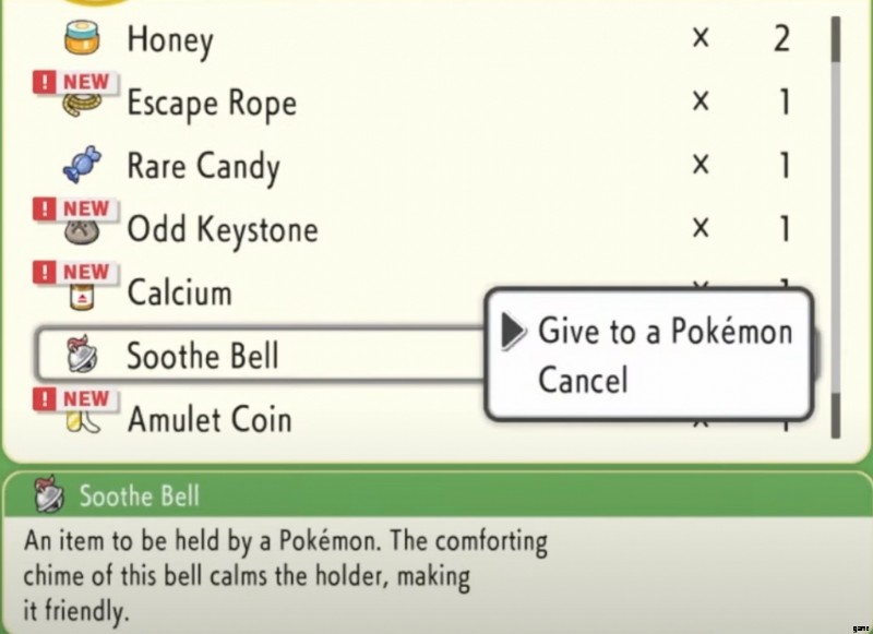 友情を高めるには、ポケモンと一緒に歩き回ったり、バトルしたり、バトルアイテムを使用したり、パーティーの前に置いたりすることができます.また、友好度を高める保持アイテムであるSoothe Bellを渡すこともできます。