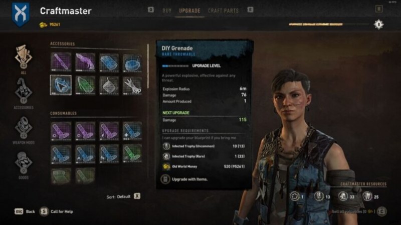DIY グレネードは 76 ダメージを与え、爆発半径は 6 メートルです。 DIY グレネードの設計図をアップグレードして、より広い範囲の効果で最大 115 のダメージを与えることができます。ただし、次のものも必要です: