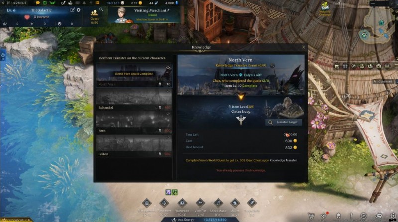 たとえば、North Vern の Knowledge Transfer を購入した場合、そのクエストラインを完了し、キャラクター レベル 50 を持っている必要があります。さらに、アイテム レベル 10 と 600 ゴールドも必要です。