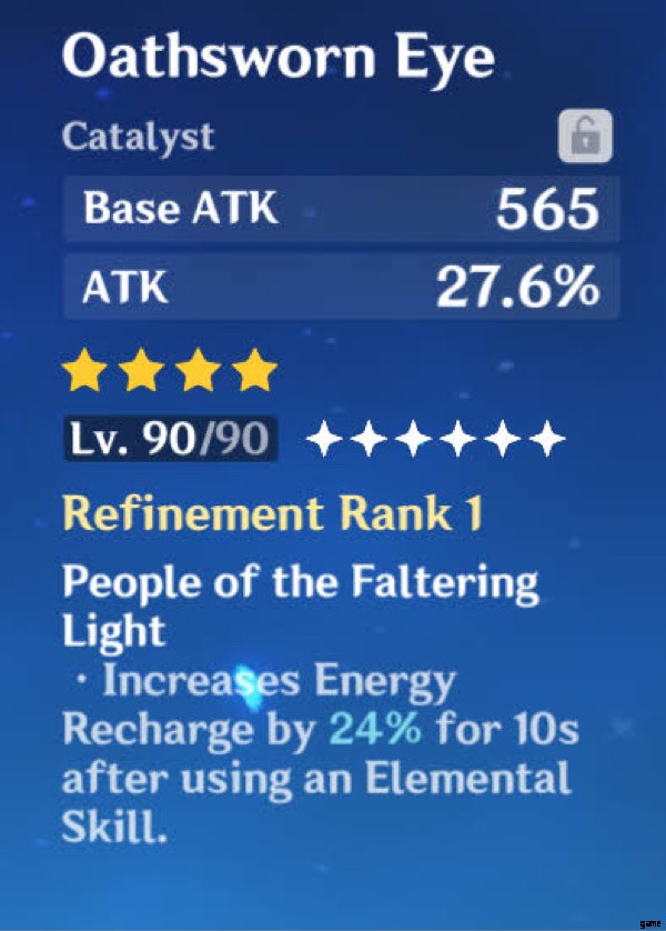 Oathsworn Eye は 4 つ星の触媒であり、レベル 1 で ATK ベースとサブスタットを提供します。ただし、レベル 90 に上昇すると両方のスタッツが大幅に向上し、565 ベース ATK スタッツと 27.6% ATK サブスタットを誇っています。