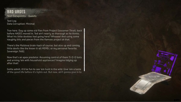 「Bad Urges」というタイトルのこのノートブック エントリには、プロジェクト ゴッサマーと呼ばれる特定の任務に関するファロのファイルの詳細を示すテキスト ログが含まれています。このメッセージは、プロジェクトに接続されたいくつかのマシンについて暴言を吐いていますが、「Sovereign 7482」について言及しています。