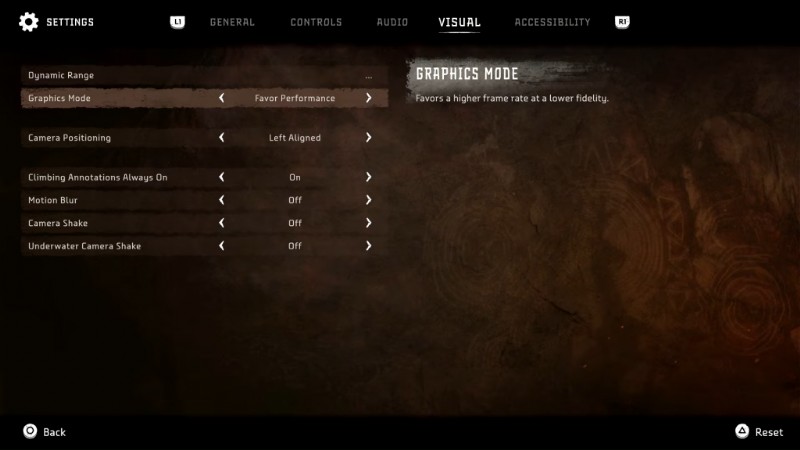 ゲーム内設定から [ビジュアル] タブに移動して、Horizon Forbidden West で目的のグラフィック モードを選択できます。また、両方のエクスペリエンスを取得したいときはいつでも、両方のグラフィック モードを切り替えることができます。