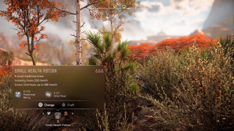 Aloy's Hunter's Kitを使用して、フィールドでヘルスポーションを作成できます。クラフト メニューにアクセスするには、DualSense コントローラーの方向パッドの下ボタンを押し続けます。