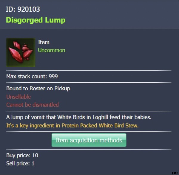 これはアンコモン アイテムであるため、Disgorged Lump は「取引不可」であり、破壊することもできません。それにもかかわらず、このアイテムはタンパク質が詰まった白い鳥のシチューを生成することができ、作成時にレスラミスの冒険者の書を完成させるために不可欠です.