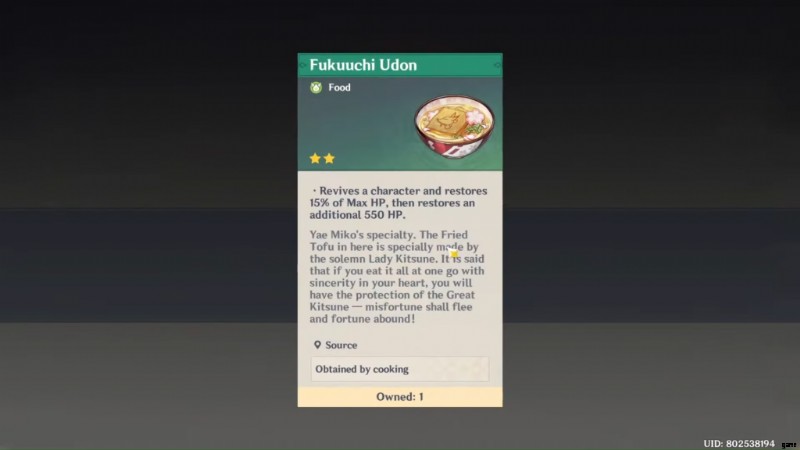 福内うどんのレア度は星 2 で、この料理を食べるとキャラクターが復活し、最大 HP の 15% を回復し、さらに HP を 550 回復します。