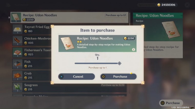 最初に行う必要があるのは、イナズマにテレポートして志村のところに行くことです.店主の志村官兵衛に話しかけ、うどんのレシピを2250モーラで購入。