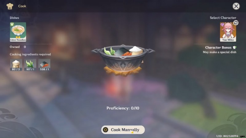 すべての材料が揃ったら、[調理] ボタンをクリックし、画面の右上からキャラクターとして八重巫女を選択します。その後、[手動で調理] ボタンをクリックして、福内うどんを調理します。