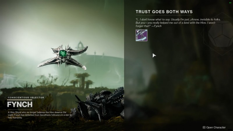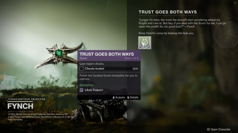 Destiny 2:魔女の女王の拡張により、ゲームを進めるための新しいクエストが追加されました。そのうちの 1 つは、Trust Goes Both Ways クエストです。遊んでいると、もはやハイブが光に値するとは信じていないハイブ ゴーストであるフィンチに遭遇し、彼のためにスコーンに対処することを望んでいます。