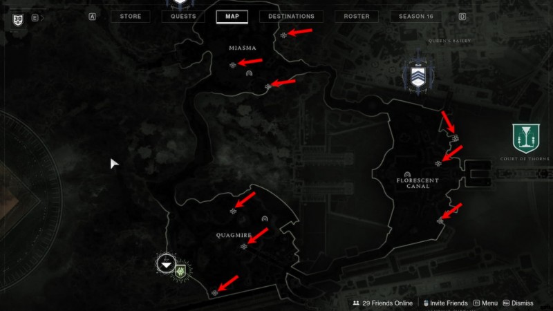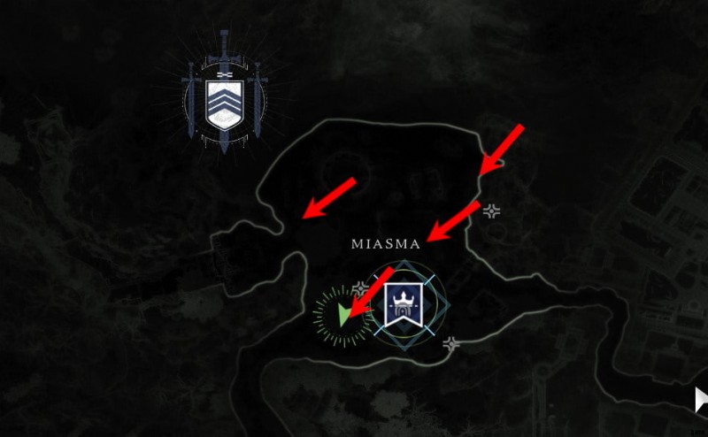 その後、Miasma で 2 つのパトロールを完了し、4 つのファクション チェストを略奪する必要があります。これらのチェストは、このエリアを歩き回ることで見つけることができます。または、下の地図でマークされた場所を確認することもできます。