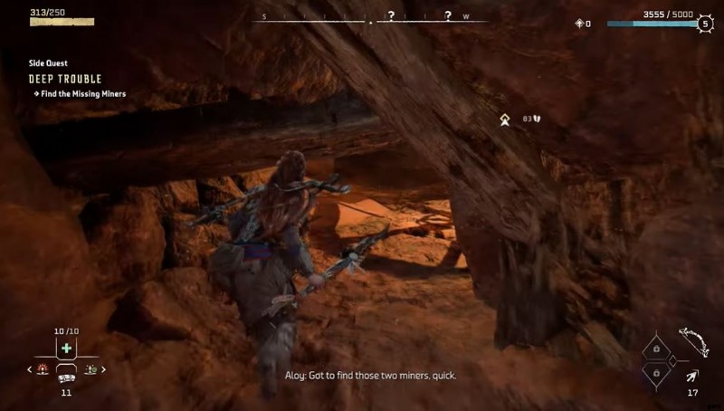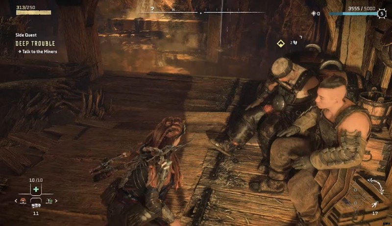 最終的に再浮上すると、Thorden と Lokuf の 2 人の鉱山労働者にたどり着きます。鉱山労働者に話しかけて、カットシーンを有効にします。その後、アーロイは次の目的について説明を受けます。