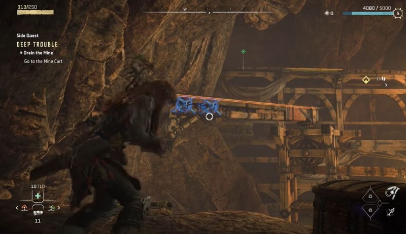 破片がシャフトをふさいでいることに気付くでしょう。Aloy は、トロッコで爆発物を使用して閉塞を取り除くことをほのめかします。 4 つのビームを飛び越えて、トロッコに向かいましょう。