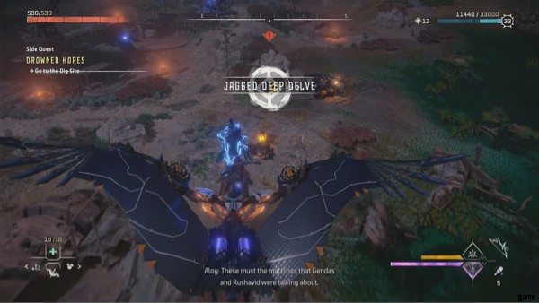 それにもかかわらず、プレイヤーが Camp Carja から開始した場合、学者は最近の発見について Aloy と話し合います。Aloy はオブジェクトを遺物の一部として特定します。学者との対話を完了した後、プレイヤーはジャグド ディープ デルブの発掘現場に向かい、この地域を脅かす機械を処理することができます。