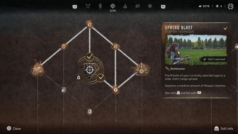 Horizo n Forbidden Westのさまざまなスキルツリーから、武器タイプごとに合計3つの武器テクニックのロックを解除できます.これらの武器の種類には、ハンター ボウ、ウォリアー ボウ、ボルトブラスター、ブラスト スリング、シュレッダー ガントレット、スパイク スローワーが含まれます。