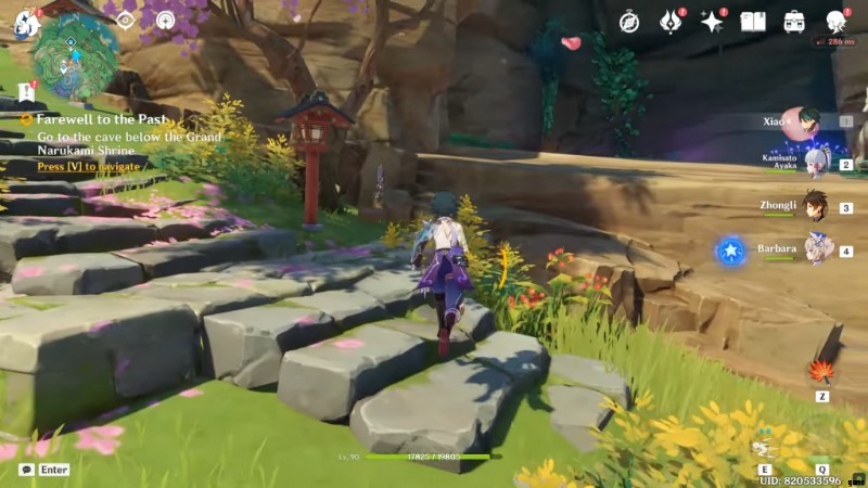クエストを開始するには、イナズマ地方の鳴神島の北西荒海にあるテレポートウェイポイントに向かう必要があります.クエスト エリアに到達したら、エレメンタル ビジョンを使用して、山の棚につながる青いトレイル マークをたどる必要があります。
