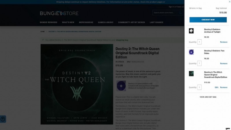 Bungie デジタル ストアから購入できるさまざまなアイテムがありますが、最近リリースされた Destiny 2:The Witch Queen Original Soundtrack Digital Edition を入手することをお勧めします。価格は 10 ドルで、MP3 形式、高品質の Apple Lossless、および FLAC 形式の 2 時間の音楽と、作曲家からの転送付きのデジタル ライナー ノートが提供されます。