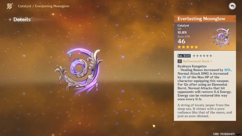 Kokomi のバナーは Genshin Impact 2.5 アップデートで復活し、新しい武器バナーを介して彼女の武器、つまり Everlasting Moonglow Catalyst も復活しました。この武器はパッチ 2.1 で初めて導入され、この武器を装備しているキャラクターの最大 HP の 1% だけ、回復ボーナスを 10%、通常攻撃ダメージを 1% 増加させます。