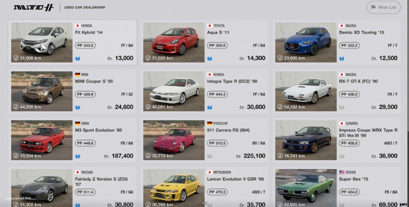 グランツーリスモ 7 のキャンペーン モードのオープニング ステージでは、プレイヤーは 3 台のスターター カー リストから最初のホイール セットを取得します。スターター カーの価格と機能はさまざまで、さまざまな長所と短所があります。