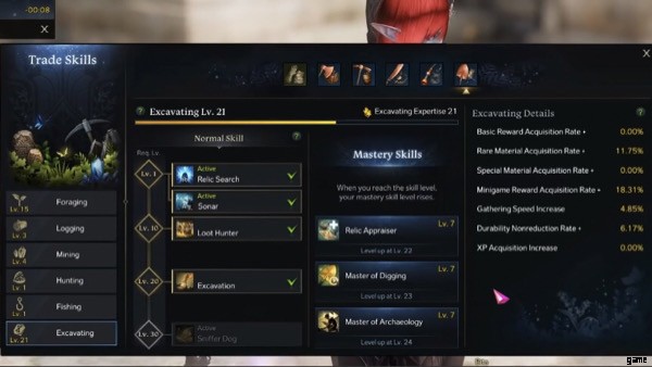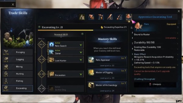 さらに、専門化できる発掘トレード スキルに関連付けられたマスタリー スキルがいくつかあります。発掘トレード スキルをアップグレードすると、遺物鑑定士、採掘者、または考古学者のマスターになることができます。