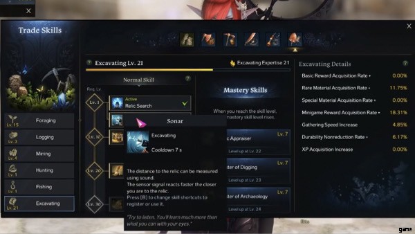 宝物を探して見つけるために発掘ツールと能力を使い続けると、取引スキルをレベルアップしてより多くの能力をアンロックできます。ガイドのクエストラインを完了すると、ソナーとレリック サーチを受け取りますが、残りのスキルはそれぞれレベル 10、20、30 でアンロックされます。