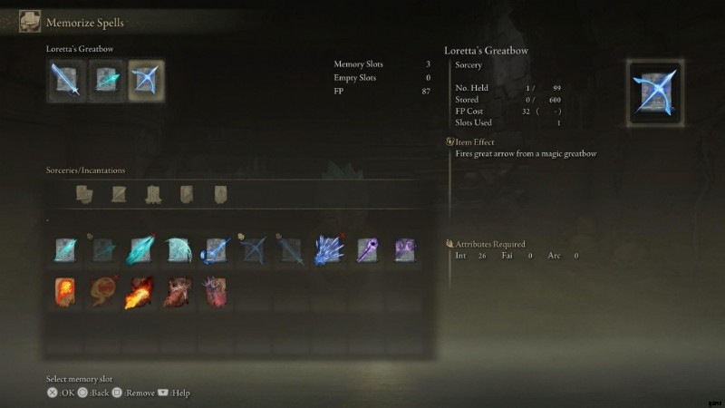 ロイヤル ナイトのロレッタを倒すと、ロレッタのグレートボウ スペルが手に入ります。この呪文を使用するには、知性が 26 必要です。