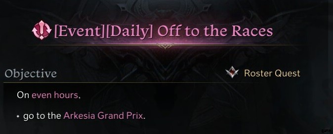 Arkesia Grand Prix イベントに参加するには、プレイヤーはレベル 50 である必要があります。アクションに参加するには、各主要都市にいる「アルケシア グランプリ マネージャー」という名前の NPC に話しかけるだけです。この NPC (マップ上のピンクのマーカーを探してください) は、「[イベント][デイリー] アリーナに行く!」を付与します。 「[イベント][デイリー] アリーナに行こう!」そして「オフ・トゥ・ザ・レース」デイリークエスト。