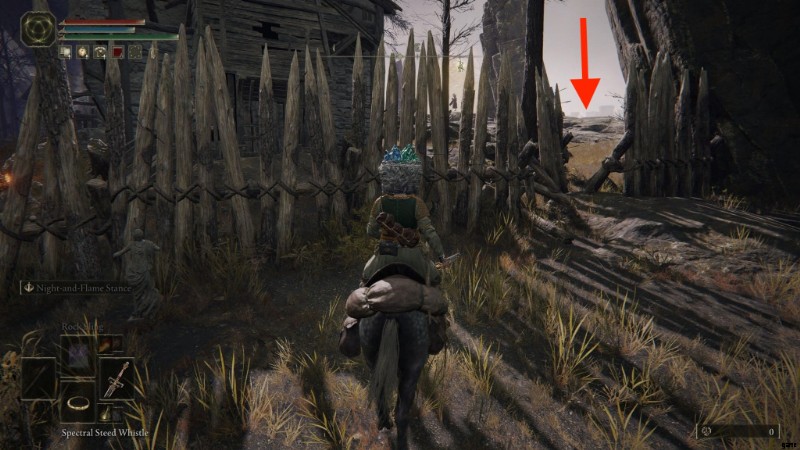 マリカの杭で目覚めたら、村の入り口から押し入らないでください。代わりに、上の写真のように右側の開口部を使用して、まっすぐ進みます。掘っ立て小屋と木の間に挟まれて、ボスアリーナに向かいましょう。