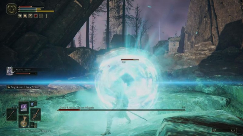 戦場にいるのがあなた、あなたのスピリットアッシュ、そして亜人の女王マギーだけであれば、戦いはずっと簡単になります.残念ながら、後者は魔法攻撃に弱いので、数回のヒットで彼女を倒すことができる夜と炎の剣またはロックスリング呪文のいずれかを使用することをお勧めします.