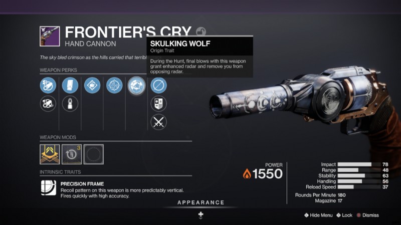 悲しいことに、アイアン バナーは 2 つのオリジン トレイトを持つ武器をドロップできますが、フロンティアズ クライはスカルキング ウルフの 1 つしかドロップしません。これは、アイアン バナーでハントがトリガーされたときにのみアクティブになる非常に状況に応じた特典であり、トドメを刺した後にレーダー機能が強化され、レーダーから見えなくなります。