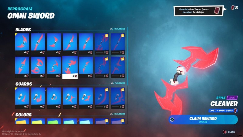 これらのボーナス チャレンジは、最新の Fortnite バトル パスでアンロック可能なアイテムの 1 つであるオムニ ソードに関連付けられています。バトルパスをレベルアップした後にオムニソードのロックを解除すると、さまざまな側面をカスタマイズするオプションが得られます.そのためには、オムニ チップが必要です。Fortnite でオムニ チップを入手する方法は次のとおりです。