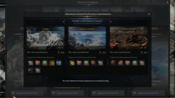Procyon's Compass にアクセスしたら、「Adventure Island」カテゴリを選択して、すべての島の利用可能性とそれらがいつ出現するかを表示します。さらに、ゲーム内通知を有効にすることもできます。これは、アドベンチャー アイランドがスポーンしようとしているときに警告します。