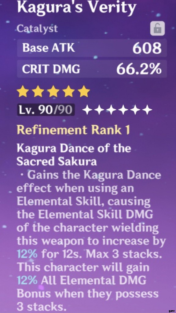 Kagura's Verity は、どの Catalyst キャラクターも使用できる印象的なステータスを誇っています。武器がレベル 90 に上昇すると、608 の高いベース ATK と 66.2% の CRIT DMG サブ ステータスを持ちます。