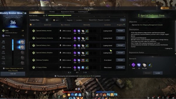 ウナのタスクを完了するごとに 10 評判ポイントを獲得できます。1 つのクエストを複数回リプレイして評判ポイントを獲得し、ロパン島トークンを獲得できます。ウナのタスクは、キャラクターごとに 1 日 3 つまでしか実行できません。ただし、代替キャラクターまたはウナのタスク トークンを使用すると、これをより迅速に行うことができます。