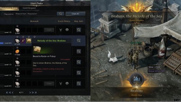 100 評判ポイントを獲得したら、ウナのタスクに移動し、評判ステータスの下で、海のメロディー:ブラームスのクエスト アイテムを含む報酬を受け取ることができます。インベントリ内でアイテムを見つけ、手紙を読んで報酬として船を入手してください。