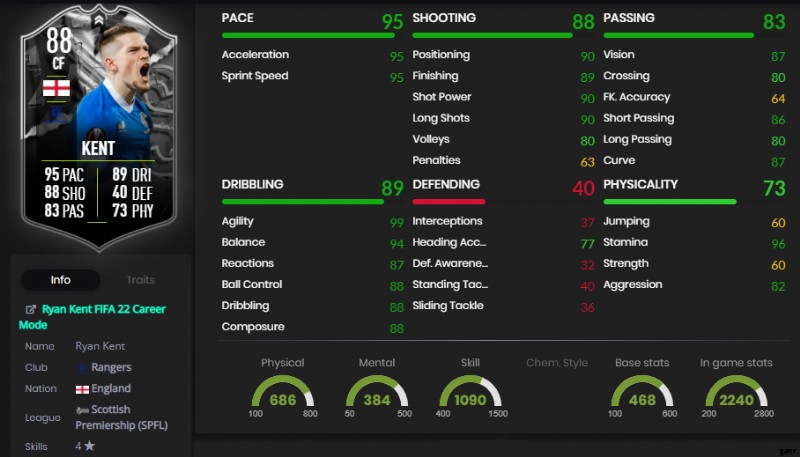 Ryan Kent Showdown カードの OVR は 88 で、OVR が 76 のベース ゴールド バージョンよりも大幅に改善されています。