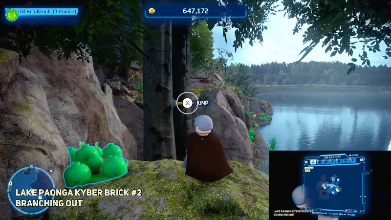 このレンガを見つけるには、巣にいるボグウィングが見える岩の多い台に飛び乗る必要があります。ライトセーバーを投げて巣を破壊し、下にある枝を明らかにします。次に、この枝とその後ろにある別の枝を使用して棒高跳びを渡り、反対側に到達して Kyber Brick を見つけることができます。