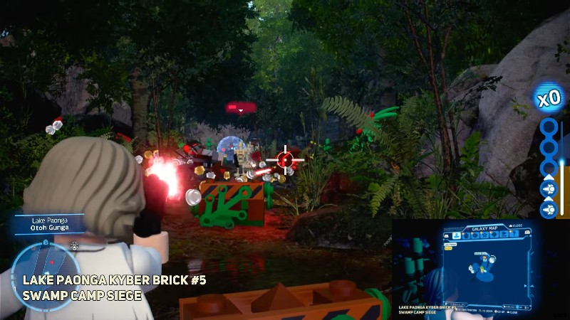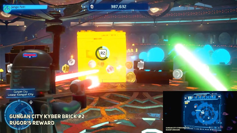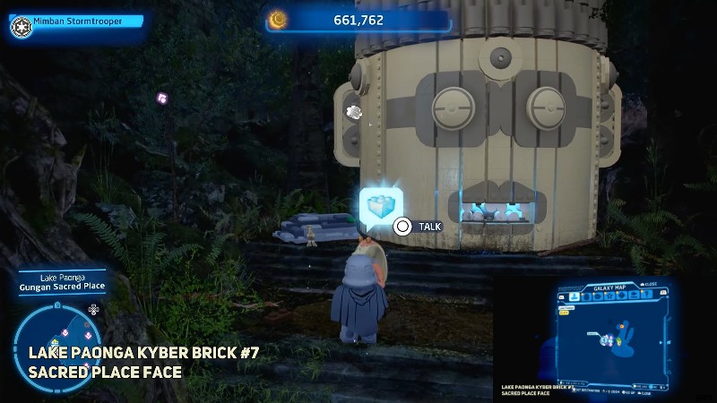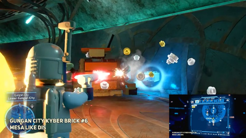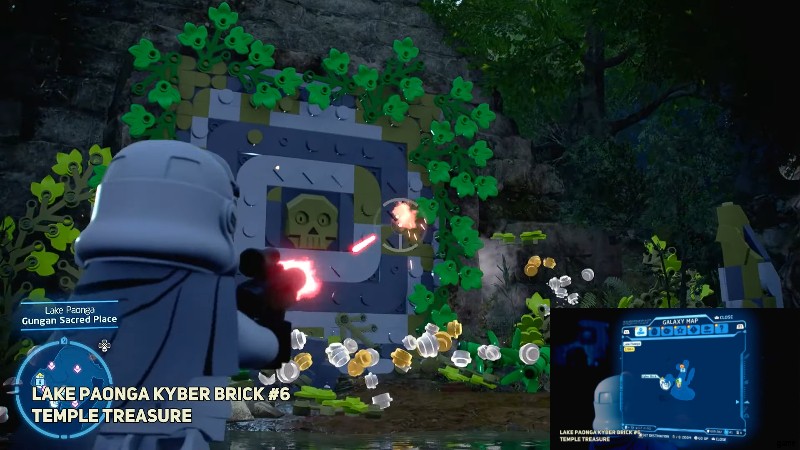 このレンガは、グンガンの聖地の破壊可能な壁の後ろにある小さな洞窟にあります。まず、低木を撃ち落として壁を明らかにします。次に、ライトセーバーを持ったキャラクターを使用して、開始点と終了点を確実に接続して、壁を破壊するために任意のサイズの正方形を切り取ります。
