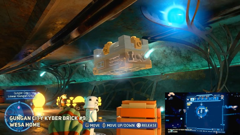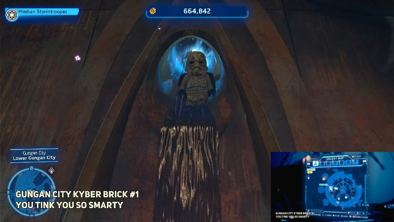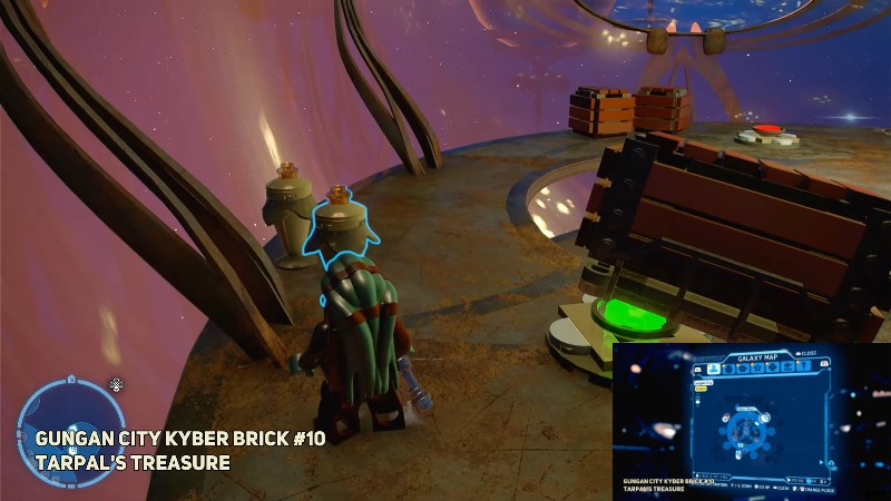 ローワー・グンガン市では、このレンガが見つかる場所で、廊下の屋根近くに浮かんでいます。それを取得するには、フォース ユーザー キャラクターの 1 人が木枠のようなオブジェクトをその下に積み上げ、それを使用してジャンプしてレンガに到達できます。