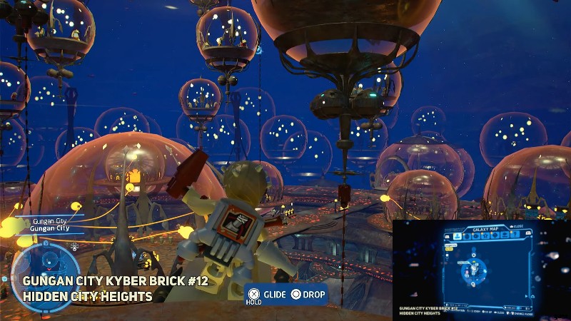 このレンガはグンガン シティのプラットフォームのはるか上にあり、ジェットパックを持ったプレイヤーが空中を移動して集める必要があります。最初はしごを使って高い位置に行き、吊り下げロープを使って登り、滑空してレンガをつかみます。