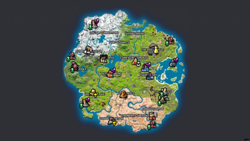 最初に行う必要があるのは、Fortnite マップで NPC を見つけることです。現在、ゲームには合計 24 人の NPC がいます。それらをすばやく見つけるには、すべての NPC の場所がマークされている下の画像を参照してください。