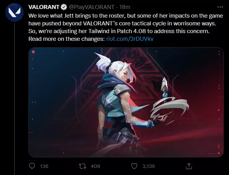 Valorant パッチ 4.08 のリリースに伴い、Jett の Tailwind に次の変更が加えられます: